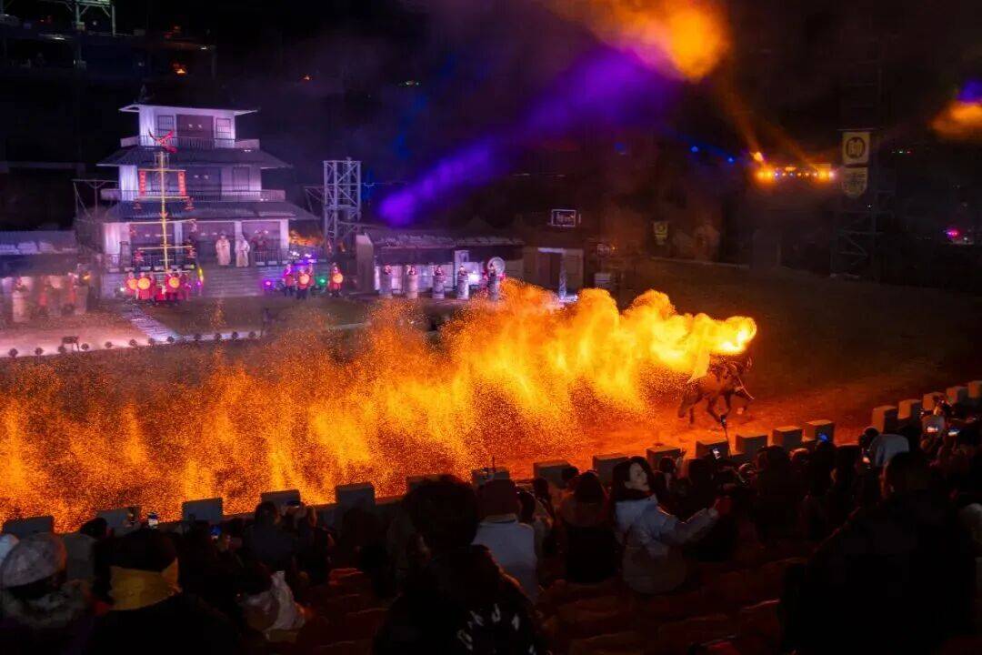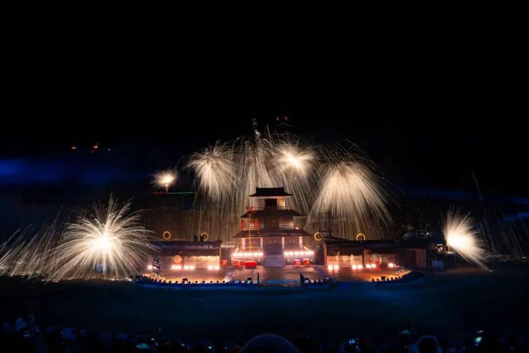 更有非遗打铁花惊艳加持,1600℃铁水奋力抡起,泼向夜空的瞬间炸成漫天金红星火,化作漫天星火,搭配牧野之战实景背景,战马嘶鸣+刀光剑影+星火璀璨,视觉冲击力直接拉满,每一帧都震撼到失语。